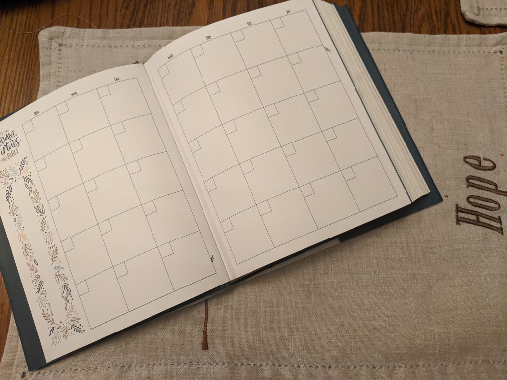 The bible also has space in the front that is laid out with a “fill in your own date” calendar and pages for prayer. This will help you stay on track of your reading plan. Right after the calendar pages there are pages for prayers. Use these pages any way that work best for you in your time with Him.